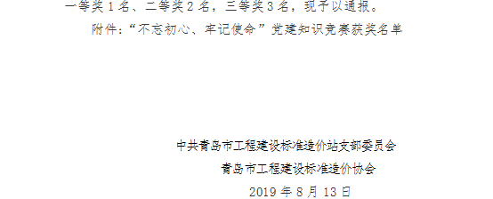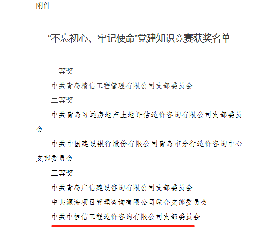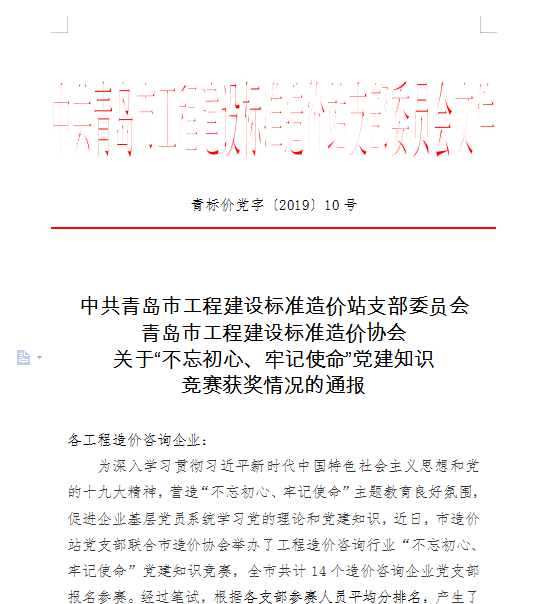 为深入学习贯彻习近平新时代中国特色社会主义思想和党的十九大精神,2019年7月29日,我公司参加了中共青岛市工程建设标准造价站支部委员会、青岛市工程建设标准造价协会举办的关于“不忘初心、牢记使命”党建知识竞赛,荣获三等奖。